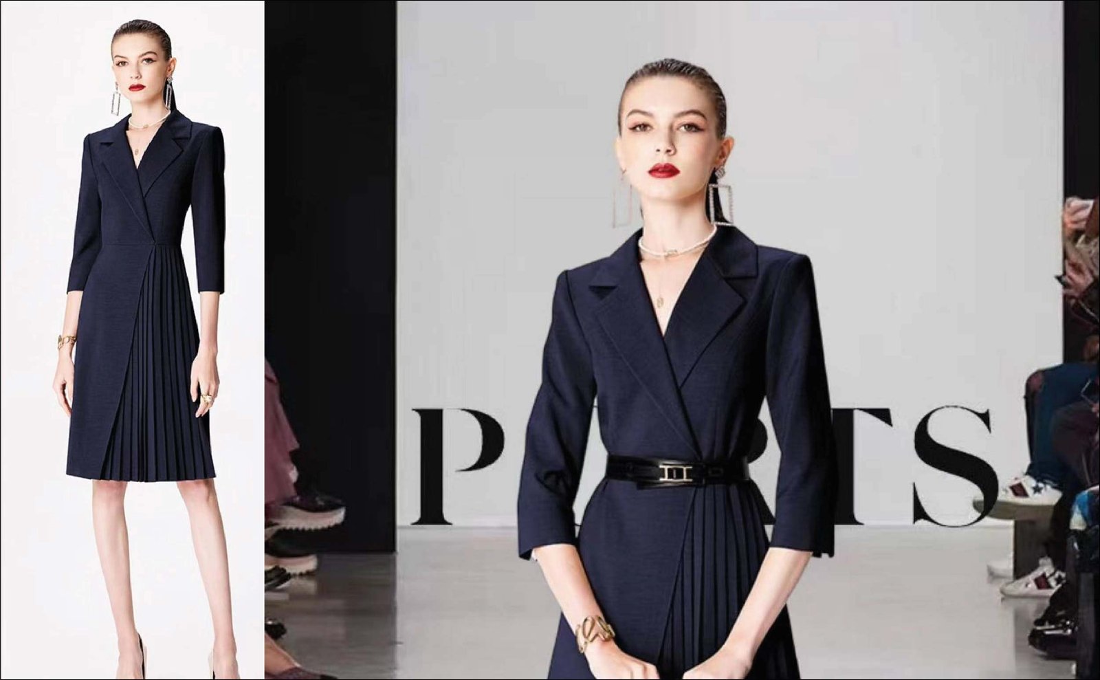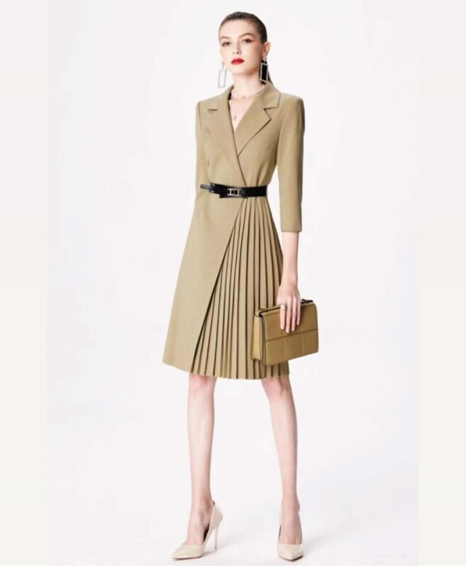 What sets this dress apart is its unique design inspired by the classic blazer. The upper part features a refined lapel collar that adds a sense of confidence and sophistication, while the three-quarter sleeves enhance practical elegance, making it an ideal choice for both formal and social occasions.