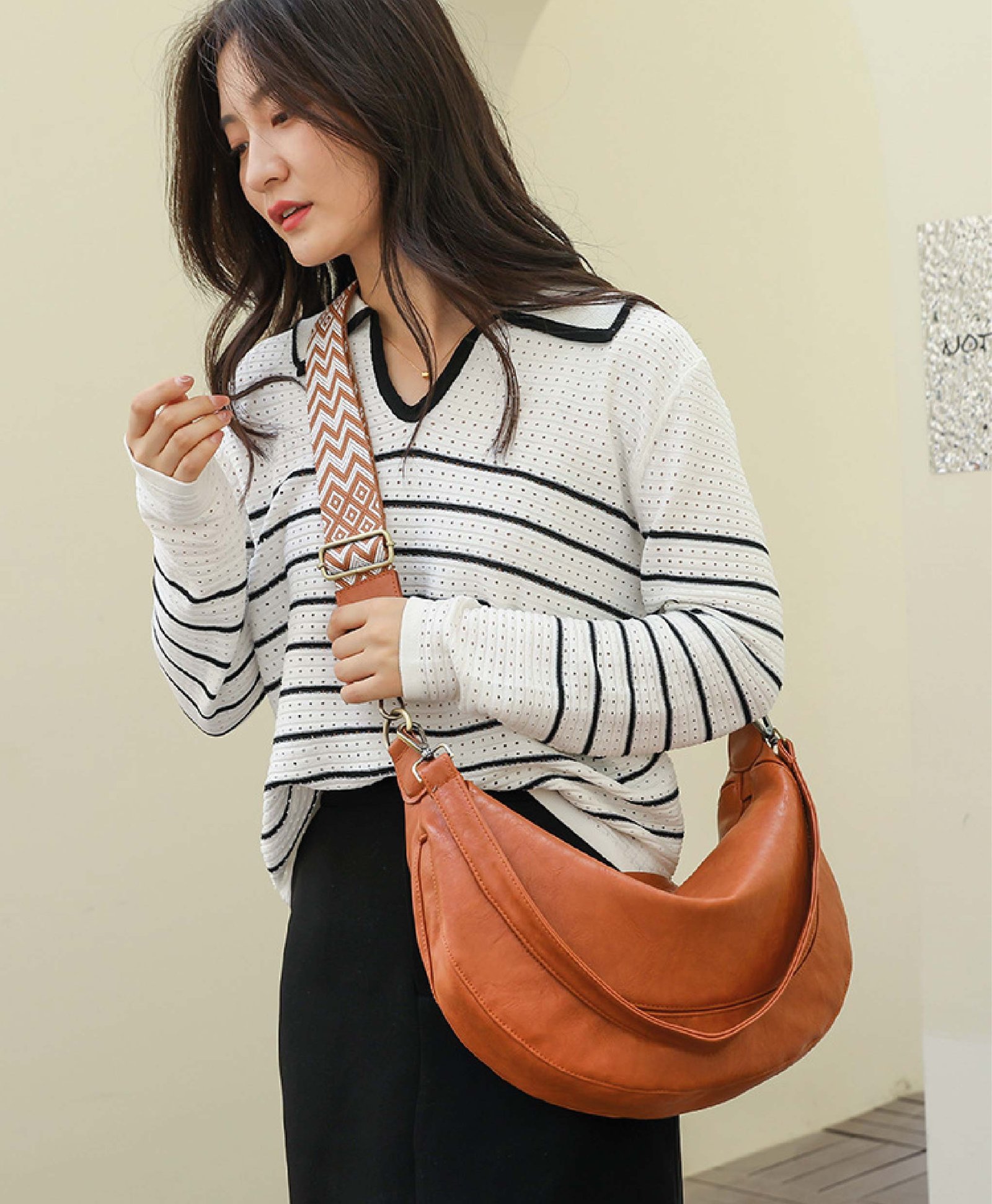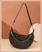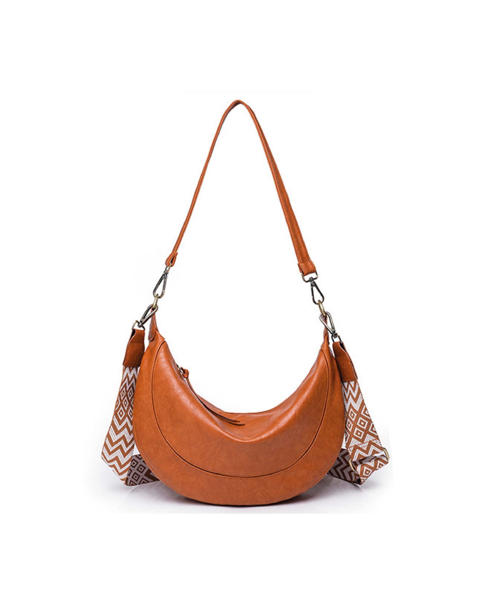 This bag features a modern and stylish design that combines elegance and practicality. Made from faux leather in a warm brown color, it adds a classic touch to your look. The bag has a unique half-moon shape, offering ample space to carry daily essentials comfortably.