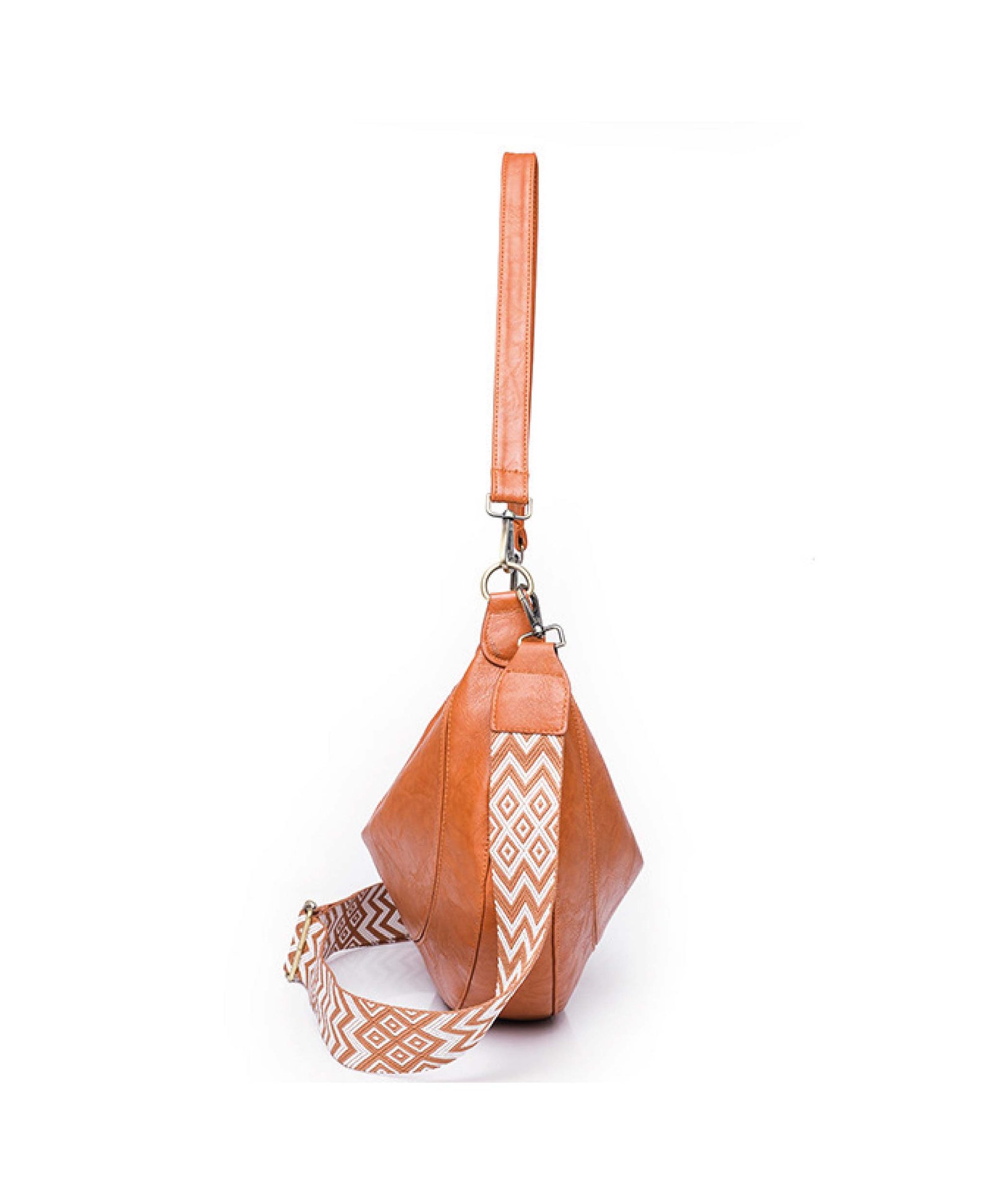 It is equipped with a long, adjustable shoulder strap to suit different needs. The sides of the bag are adorned with fabric panels featuring an attractive geometric pattern, adding a touch of vibrancy and contemporary charm.