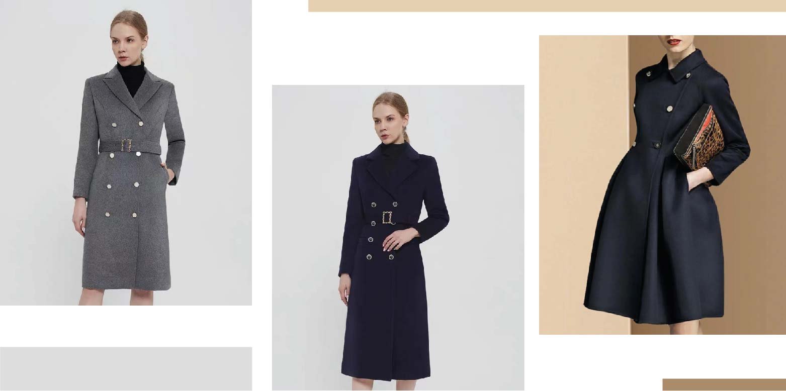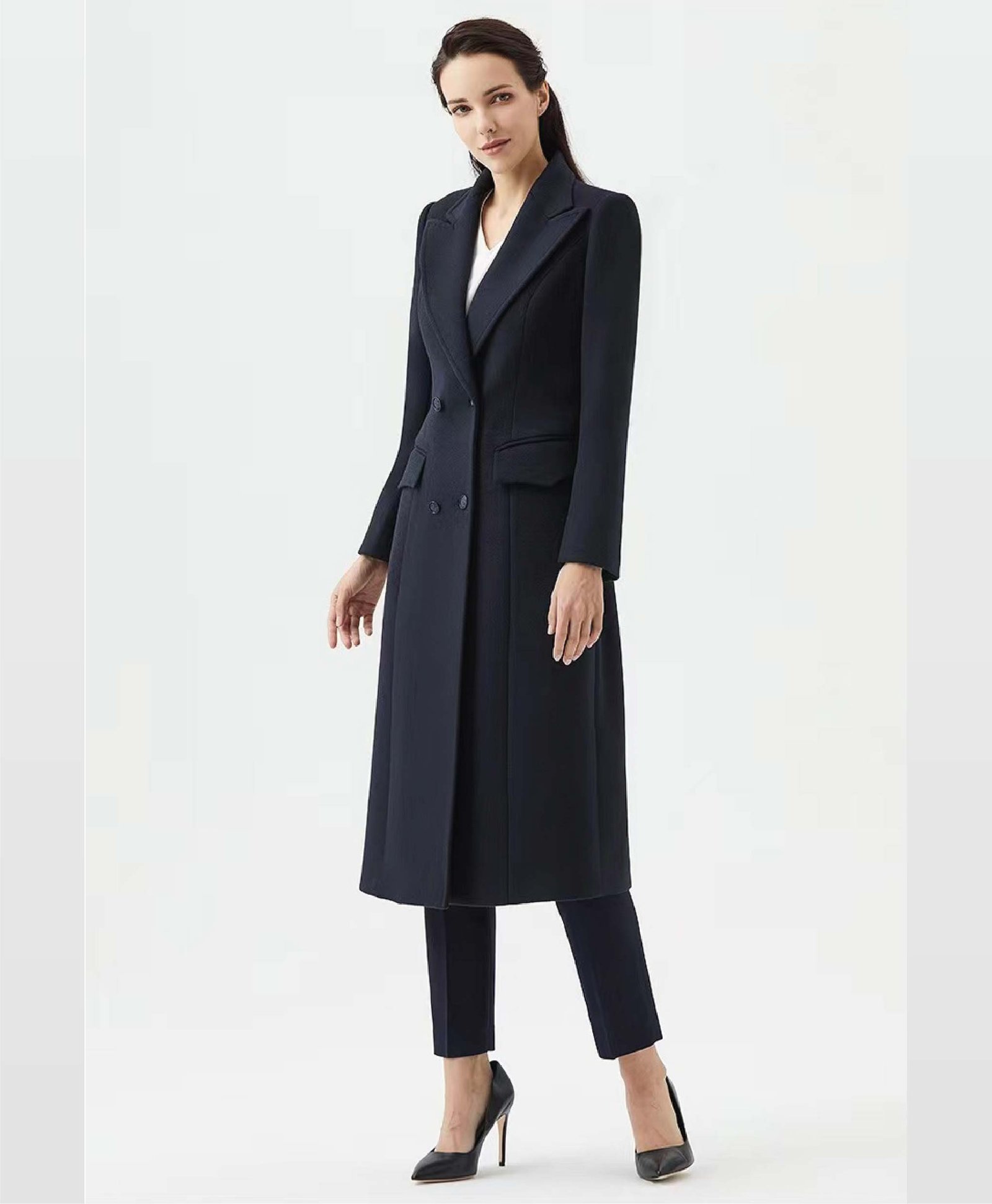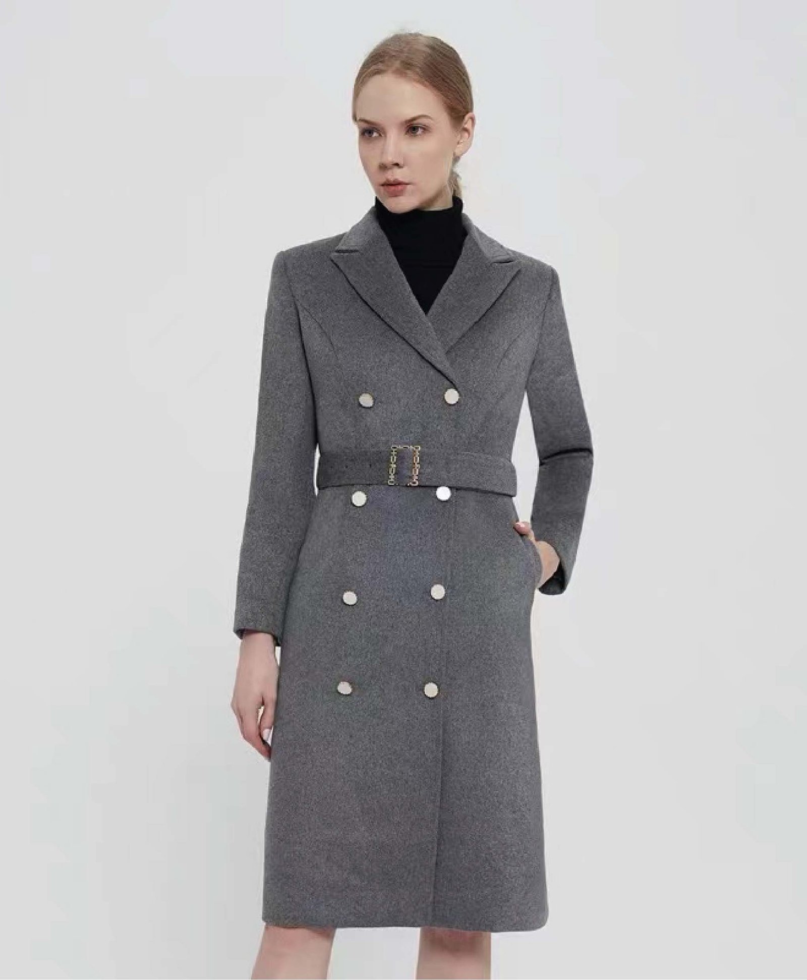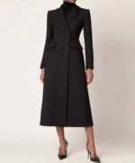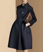 The jacket is equipped with a waist belt that enhances the silhouette and gives a beautiful feminine look. The wide lapels add a traditional yet practical touch, making the jacket suitable for both formal and casual occasions. The jacket extends slightly above the knees, providing ideal coverage and a stylish appearance.